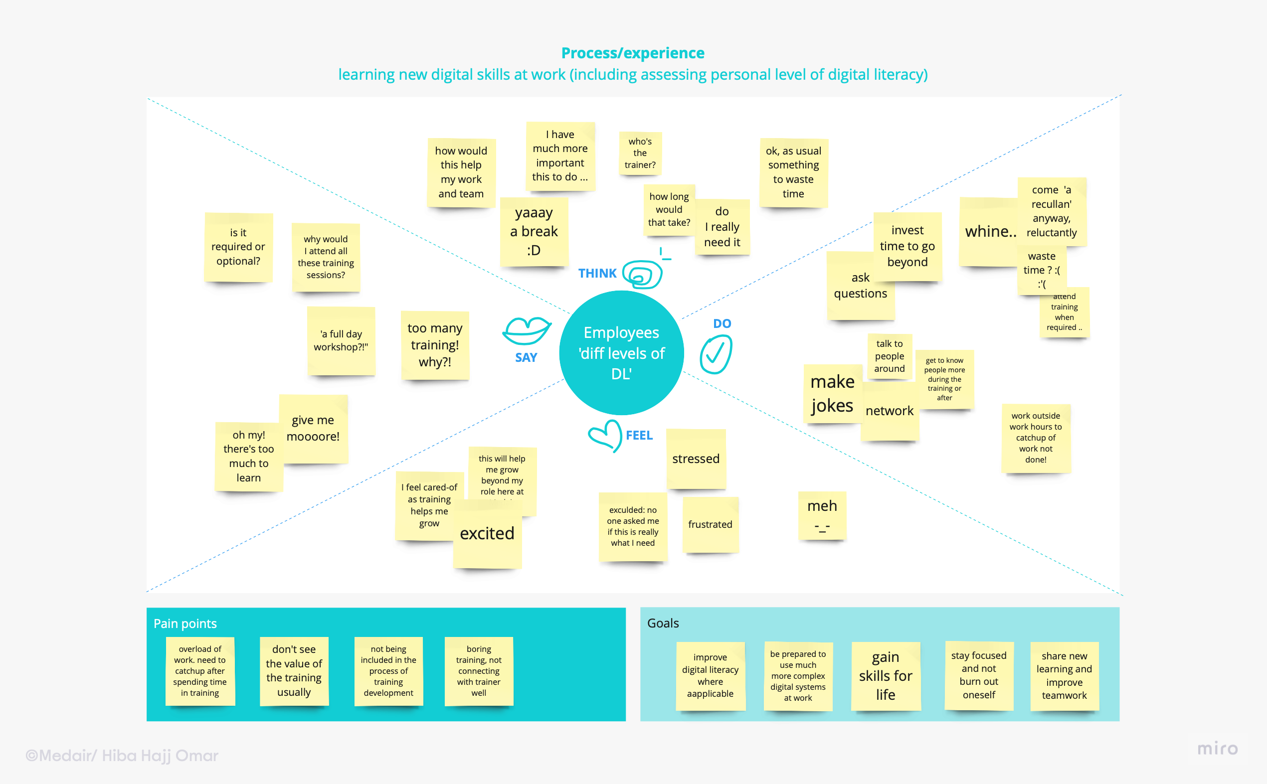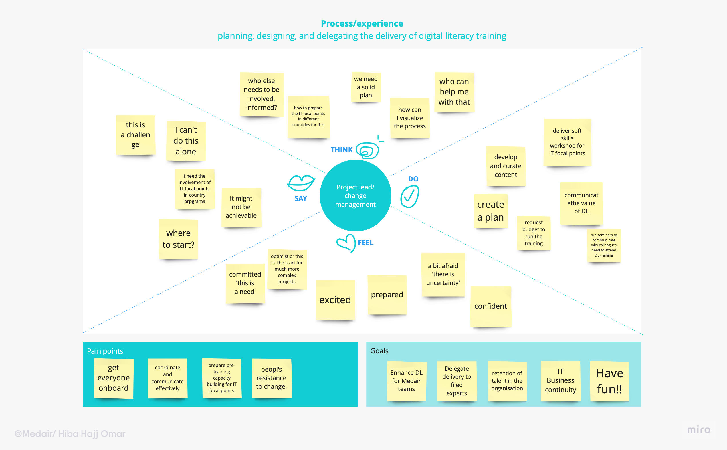 In a room full of Medair colleagues who work in the field on different specialties, I facilitated a session on user discovery and empathy mapping. We started by identifying direct users and key stakeholders that would influence the design and delivery of a digital literacy initiative.